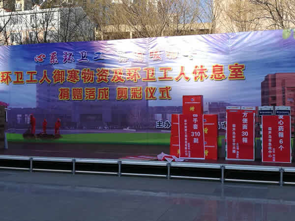 市總工會(huì)舉辦的環(huán)衛(wèi)工人御寒物資及環(huán)衛(wèi)工人休息室捐贈(zèng)落成剪彩儀式現(xiàn)場(chǎng)