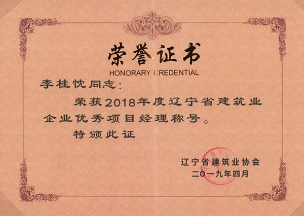 2019年5月22日,從遼寧省建筑業(yè)協(xié)會獲悉,我集團榮獲2018年度“遼寧省建筑業(yè)優(yōu)秀企業(yè)”稱號。副總經(jīng)理鐘雷同志榮獲“遼寧省建筑業(yè)企業(yè)優(yōu)秀經(jīng)理”稱號,項目經(jīng)理李桂忱、陳洪為、袁微三名同志榮獲“遼寧省建筑業(yè)企業(yè)優(yōu)秀項目經(jīng)理”稱號。