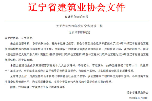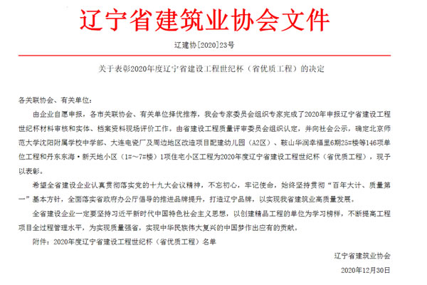 2020年12月30日,遼寧省建筑業(yè)協會發(fā)布了“關于表彰2020年度遼寧省建設工程世紀杯(省優(yōu)質工程)和遼寧省建設工程優(yōu)質結構的決定”。2020年,集團所有參評項目在前期各關聯協會、有關單位推薦的基礎上,經專家組材料審核、現場和會議評價,遼寧省建設工程質量評審委員會、世紀杯專家組認定,最終進行公示。集團2項工程榮獲 “2020 年度遼寧省建設工程世紀杯”,14項工程榮獲“2020年度遼寧省建設工程優(yōu)質結構”榮譽稱號。此次榮譽的獲得是對集團堅持精細化管理、不斷提質增效的肯定。