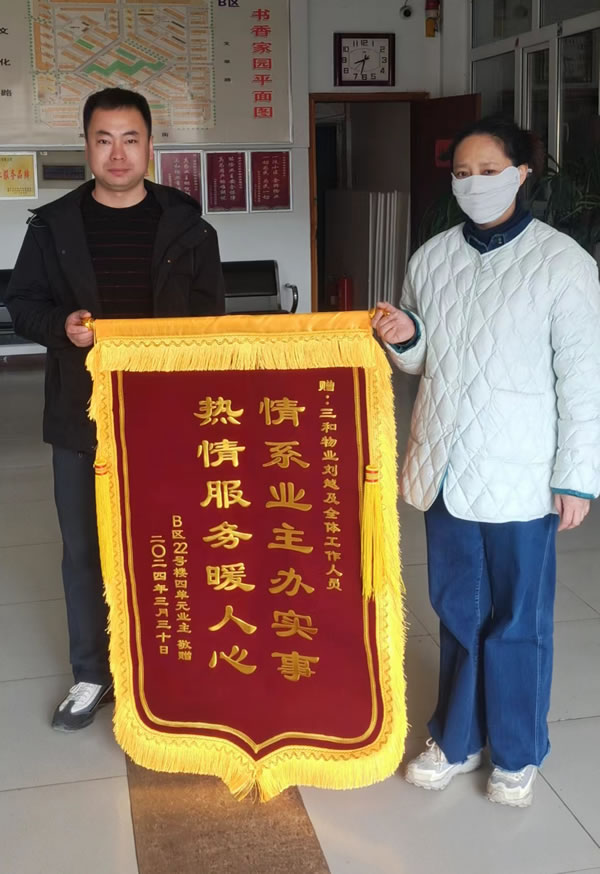 近日,書香家園B區(qū)一業(yè)主親手將一面繡有“情系業(yè)主辦實(shí)事 熱情服務(wù)暖人心”的錦旗贈(zèng)送給三和物業(yè)團(tuán)隊(duì),以表達(dá)對他們在處理下水道堵塞問題上所展現(xiàn)出的高效服務(wù)和專業(yè)務(wù)實(shí)態(tài)度的高度贊揚(yáng)與深深感謝。