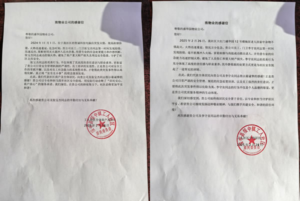 近期,綏中縣盛華園小區(qū)先后發(fā)生兩起火災(zāi)事故,所幸均被物業(yè)員工及時(shí)妥善處理,成功避免了重大人員傷亡和財(cái)產(chǎn)損失,綏中鎮(zhèn)工人社區(qū)居委會(huì)為此向盛華園物業(yè)公司發(fā)來感謝信,對(duì)兩位員工的英勇行為表示高度贊揚(yáng)。