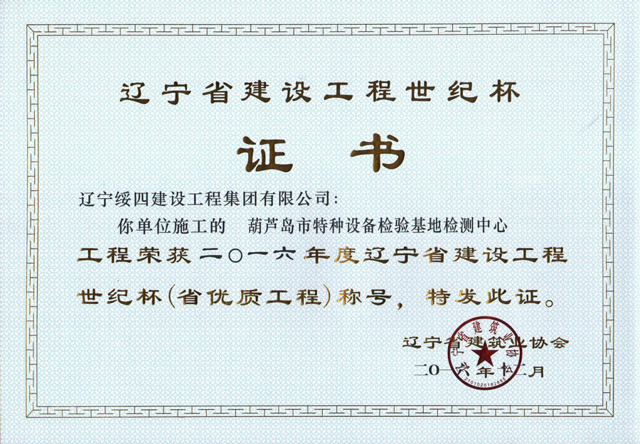 “葫蘆島市特種設(shè)備檢驗(yàn)基地檢測(cè)中心”榮獲2016年度遼寧省建設(shè)工程世紀(jì)杯稱號(hào)