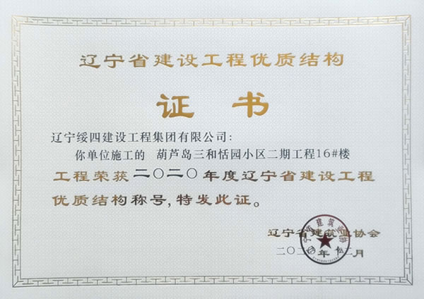 “葫蘆島三和恬園小區(qū)二期工程16#樓”榮獲2020年度遼寧省建設工程優(yōu)質結構稱號