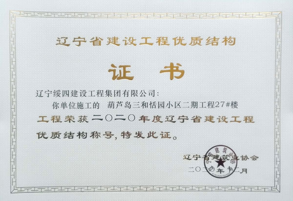 “葫蘆島三和恬園小區(qū)二期工程27#樓”榮獲2020年度遼寧省建設(shè)工程優(yōu)質(zhì)結(jié)構(gòu)稱號(hào)