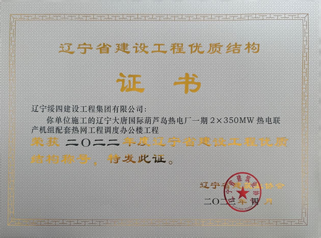 | 遼寧大唐國(guó)際葫蘆島熱電廠一期2X350MW熱電聯(lián)產(chǎn)機(jī)組配套熱網(wǎng)工程調(diào)度辦公樓工程榮獲2022年度遼寧省建設(shè)工程優(yōu)質(zhì)結(jié)構(gòu)稱號(hào) |