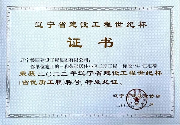 | 三和榮郡居住小區(qū)二期工程一標(biāo)段9#住宅樓 榮獲2023年遼寧省建設(shè)工程世紀(jì)杯(省優(yōu)質(zhì)工程)稱(chēng)號(hào) |